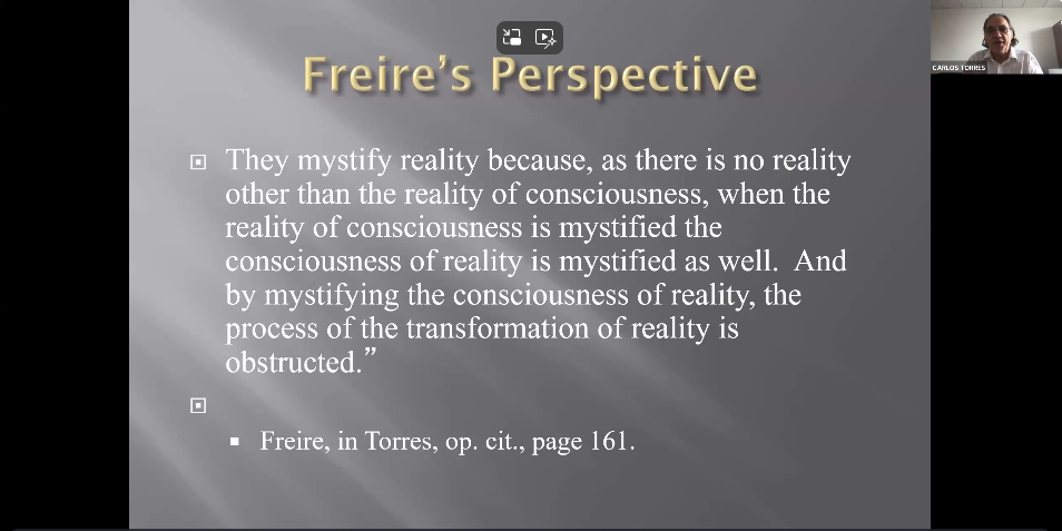 会议首先由卡洛斯·托雷斯教授进行主旨演讲,介绍保罗·弗莱雷的教育思想,以及其教育研究与实践的历史脉络。卡洛斯教授指出,保罗·弗莱雷的视角要求人们对现实进行去神秘化的揭示,通过“质疑”来解构社会生活中侵犯性、统治性、暴力性、压迫性的框架,其中对于教育的要求便是从“填鸭式”转向“解放式”教育,通过“对话”激发学生追求解放的主体性。随后,卡洛斯教授从认识论、方法论角度对保罗·弗莱雷的思想进行深入的解读,强调教育应当超越价值中立而追求美好的乌托邦理想,从人文关怀、社会历史和社会文化的角度对压迫的结构进行解构和批判。