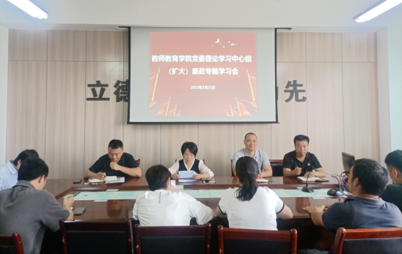 5月22日,教师教育学院党委召开理论学习中心组(扩大)廉政专题学习会,院党委书记吴银银主持会议,院党委委员、纪委委员、支部书记、三办主任参加会议。