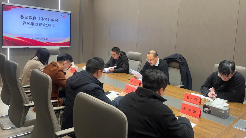 12月30日上午,教师教育(体育)学院召开2024年下半年党风廉政建设分析会。校纪委委员、后勤服务管理处处长王秋方到会督查指导,院党委书记林辉杰主持会议,院党政班子成员参加会议。