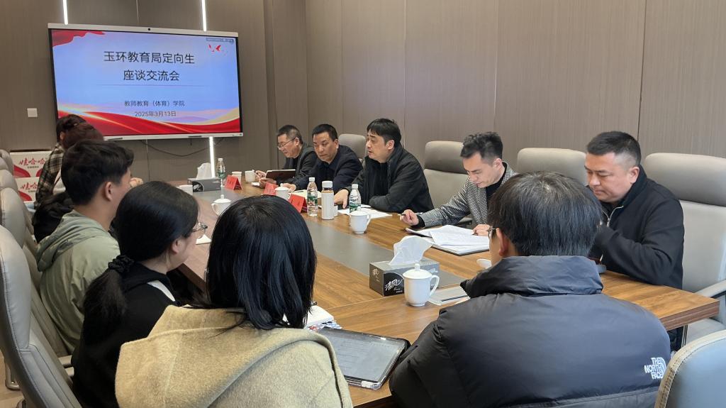 3月13日下午,玉环市教育局副局长李冰,人事科科长林群兵等一行受邀来到教师教育(体育)学院与全体玉环定向生进行座谈交流。学院党委副书记吴磊、学院副院长任翔宇参加座谈会。