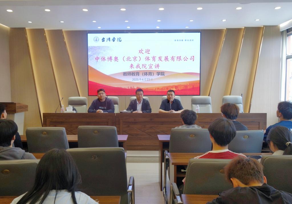 为深入贯彻落实就业优先战略,搭建校企合作桥梁,助力学生精准对接优质就业资源,4月23日,学院邀请中体博奥(北京)体育发展有限公司开展就业专场宣讲。院党委书记林辉杰、院党委副书记吴磊、相关辅导员老师以及学院部分体教专业同学参加宣讲会。