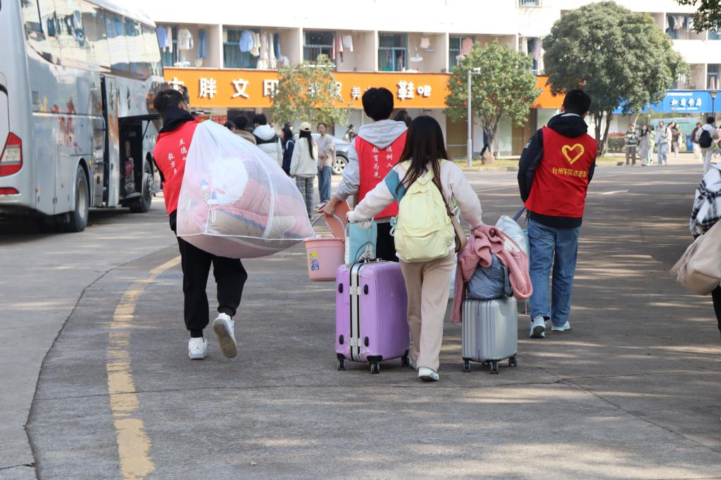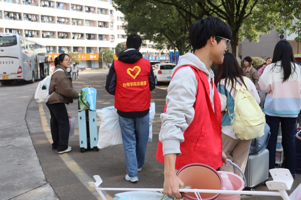 志愿者们上前欢迎新同学们。他们热诚地与同学们进行交流,帮忙搬运行李,耐心地为新同学们解答在临海校区生活、学习等方面的困惑,带领转专业同学们前往他们的新寝室。