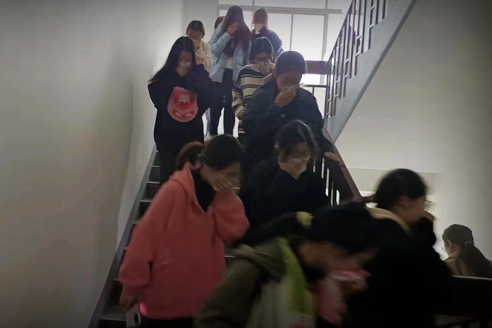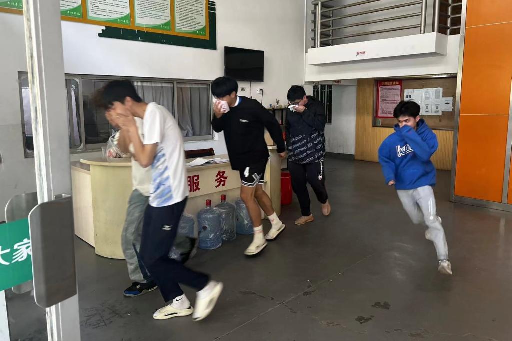 在演练过程中学生自觉用湿巾捂住口鼻,防止吸入浓烟,分成两列,有序地从楼梯撤下。最后,所有同学抵达安全地带,听着安全员讲解火场逃生自救知识。