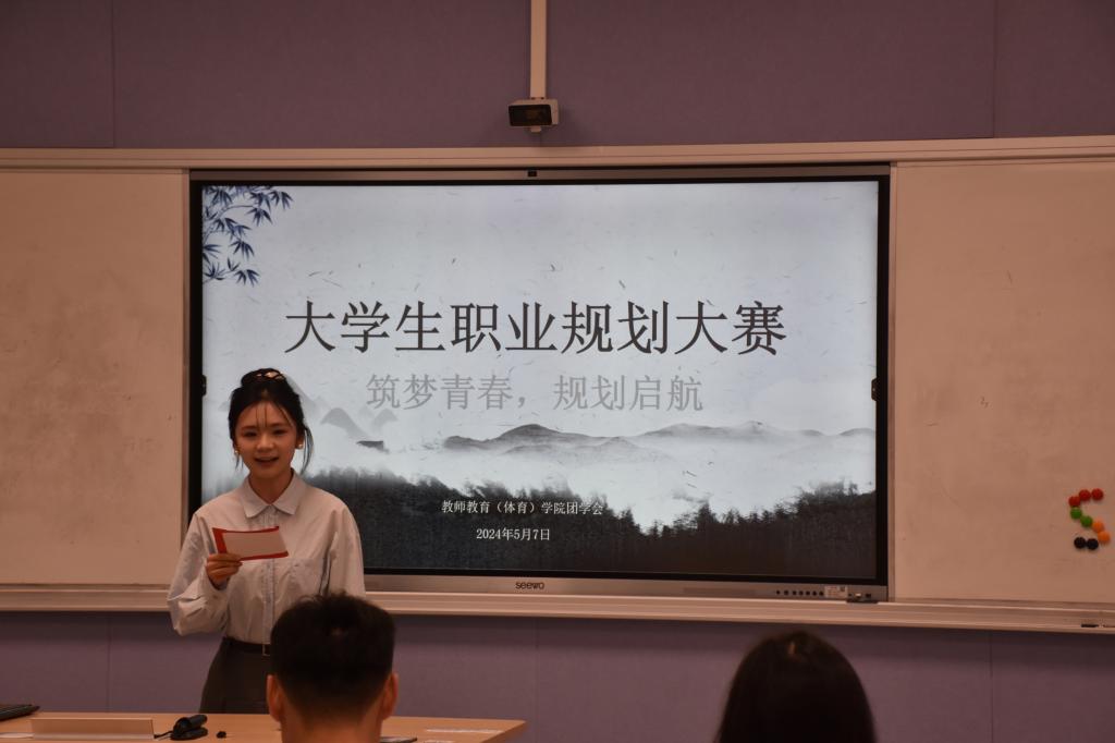 为了引导并帮助同学们合理地进行职业生涯规划,展望更加美好的未来。5月7日晚,教师教育(体育)学院于1107教室举办大学生职业生涯规划大赛,辅导员阎宝莹、徐薇、朱浩楠、朱佳婧、屈佳妮,12位选手以及各班观众参与本次活动。