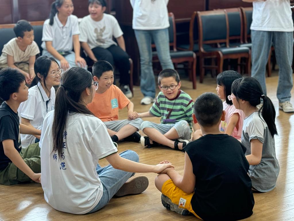 为了打破实践队员和孩子们之间的陌生感,队员们举办了破冰活动,通过一系列妙趣横生的团队游戏,初步认识了彼此,增强了队员和孩子间的信任感,促进了沟通。破冰活动在主持人的宣布下拉开了帷幕,队员和孩子们被分成六组进行游戏。现场欢声笑语不断,气氛热烈而温馨。