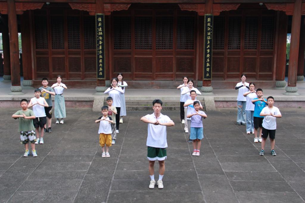 途中,老师带领孩子们习练“缩山拳”,其刚劲有力的拳风与主殿内戚继光“打拳”的复原场景交相辉映,让孩子们无不为之动容。