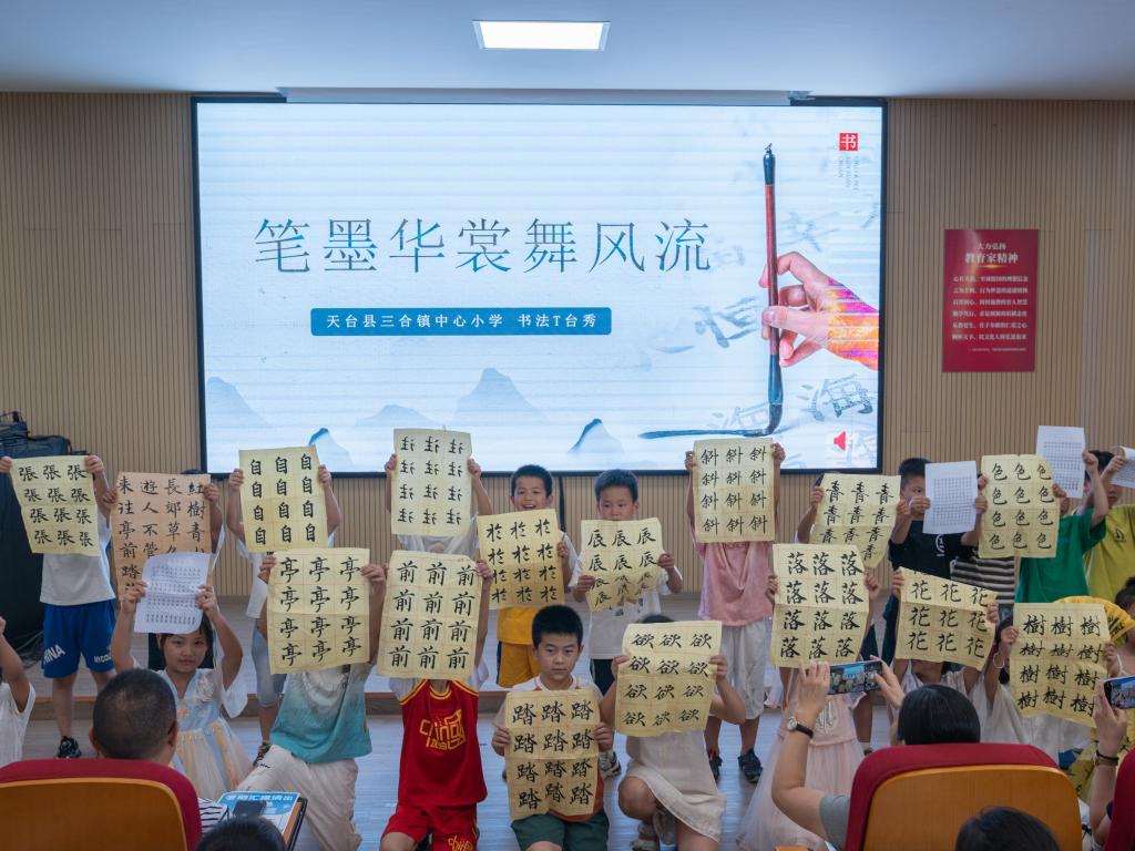 T台秀《笔墨华裳舞风流》登场,孩子们身着传统服饰,迈着自信的步伐,高举手中的书法作品,展现了在书法课程中的学习成果与中国传统文化的风采。