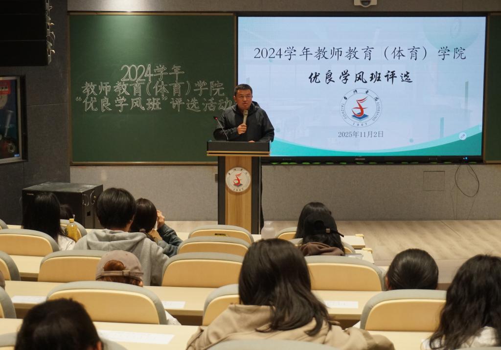 为进一步加强学院学风建设,营造积极向上、笃学力行的学习氛围,教师教育(体育)学院于11月2日晚在A6教室成功举办2024学年“优良学风班”评选活动。吴磊老师以及相关辅导员老师出席并担任评委,各班学生代表组成大众评审团参与评分。