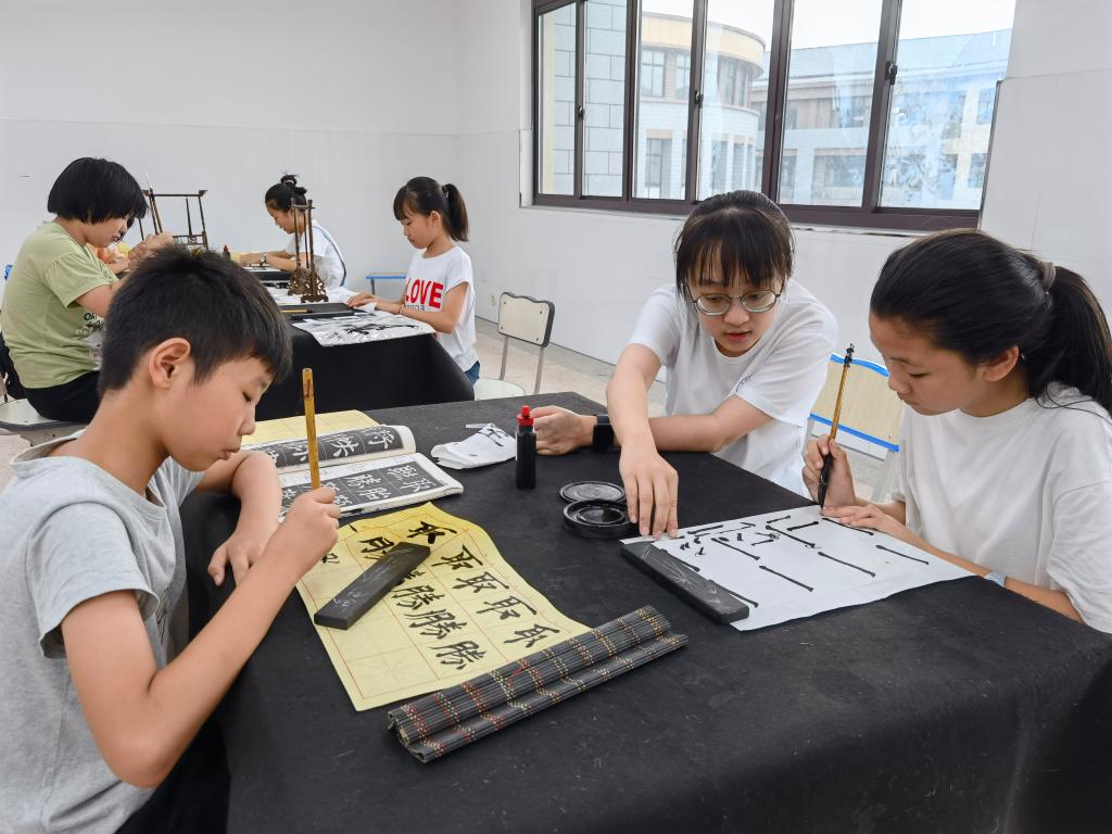 武术班级在操场上进行练习,同学们精神十足,斗志高昂,练起套路来不喊苦不喊累。美术课形式多样,扎染、超轻黏土、手绘风筝等美术活动提高了同学们的热情。朗诵班的老师强调从重音、情感两个方面理解课文,对学生耐心讲解,悉心辅导。特色班依托建党百年背景安排红色知识竞答,红色印记绘画等有意义的活动,增强学生的爱国情与爱党心。音乐舞蹈班的老师根据每个同学的基础进行适当的节奏以及动作练习,随着课程的进展不断加大难度。书法班的同老师教授基本笔画和汉字,使学生能在融会贯通中进步。