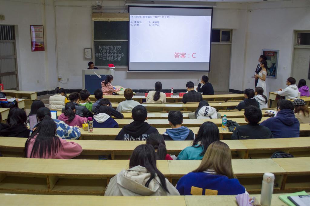 为提高大学生的综合素质,近日教师教育学院(体育学院)于A1阶梯教室举办“铄懿渊积,铄古切今”一站到底决赛。学院党委委员阎宝莹,辅导员杨华琴、朱萌,及各班代表出席。