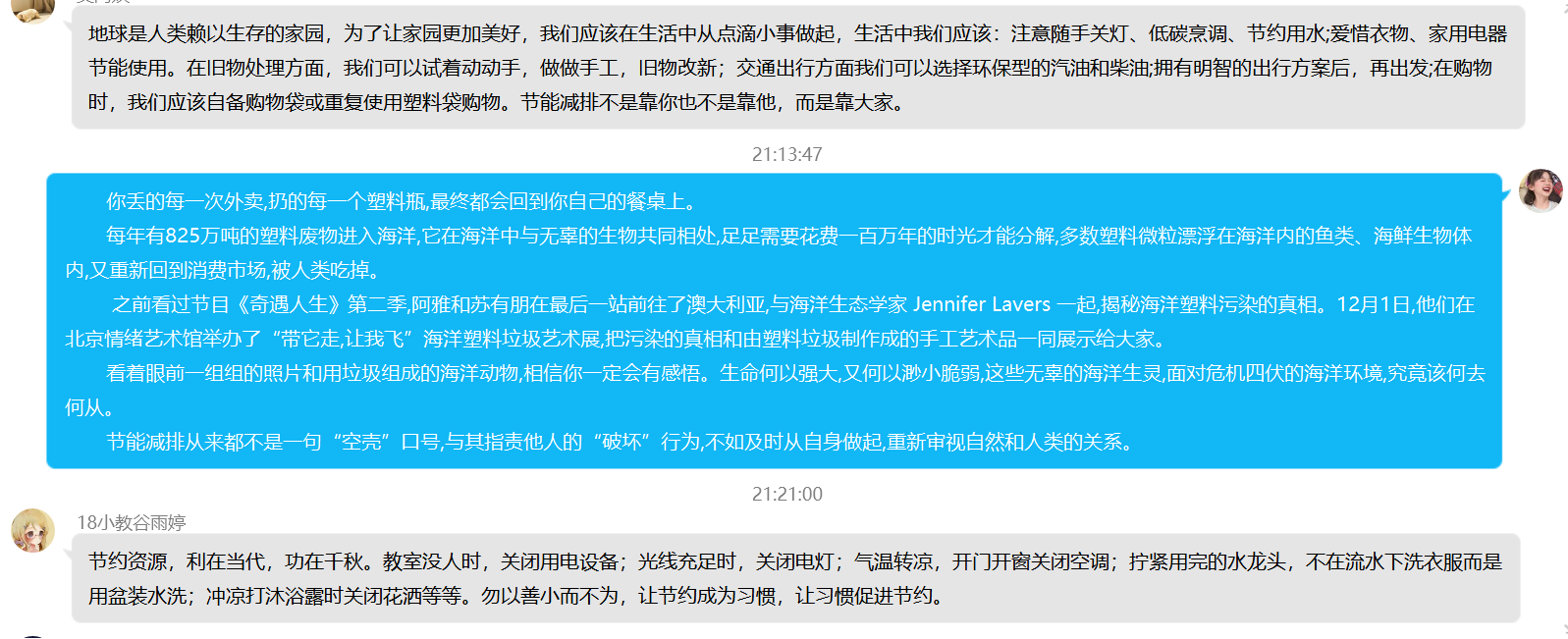 各班在团支书的带领下,通过QQ、微信与线下组织班会等方式,共同阅读并进一步了解了节能减排、碳中和等相关国家政策。会议上,团支书为大家讲解了此次主题团日的目的和意义,全体同学一起学习了相关的政策文件,观看了节能宣传视频,团支书还给大家讲解了日常生活中的节能减排相关知识和要求,为大家科普了学习和生活中的节能降耗相关知识并提出建议。