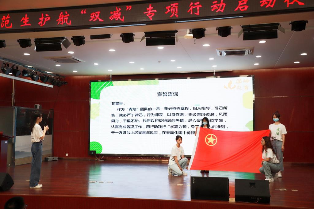 志愿者代表郭柯妤代表全体志愿者表态:把责任与爱心放在第一位,时刻保持好学的姿态和刻苦的精神,珍惜机遇、端正心态。做到在活动前期早规划,中期抓成效促落实,后期及时反思总结,共同传递师德凝结的火炬。在郭柯妤同学的带领下,全体志愿者进行了庄严宣誓。