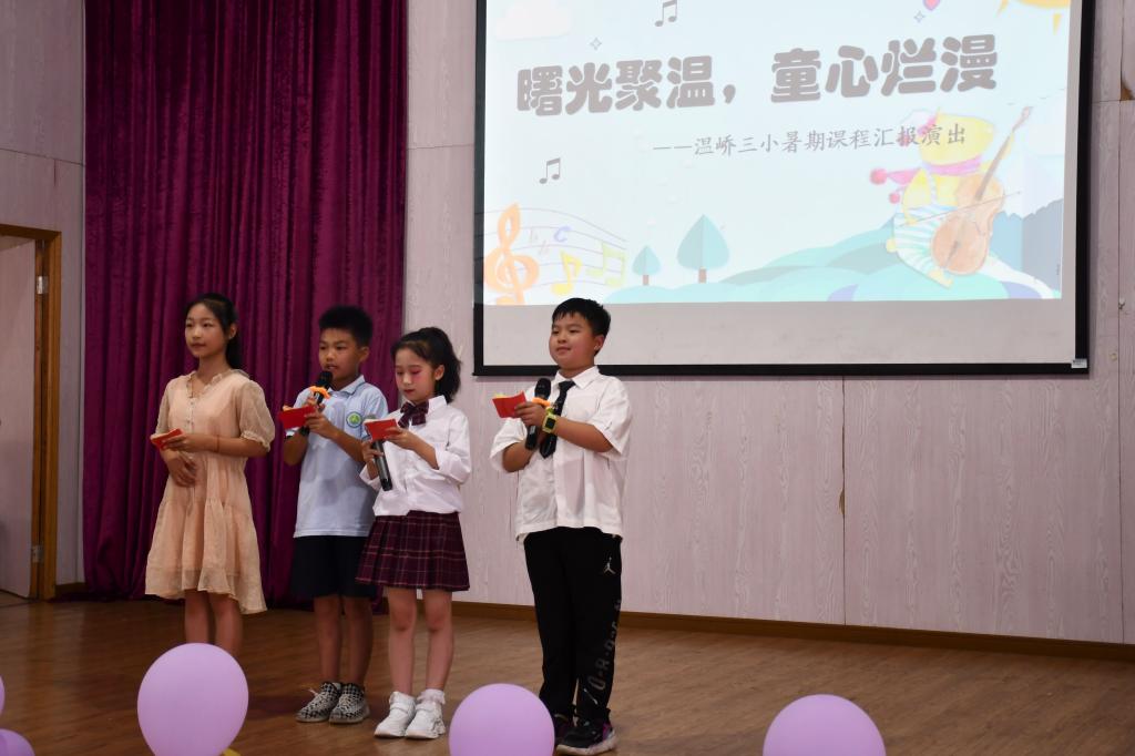 7月16日上午,温峤镇第三小学暑期课程汇报演出“曙光聚温,童心烂漫”圆满落幕。活动当天近90多名孩子和老师参加汇演,带来了武术、朗诵、舞蹈等精彩节目,尽展师生风采。其中,朗诵节目《秋瑾》再现革命家秋瑾的大义凛然的形象,将家国主义情怀教育融于艺术表演,赢得场下掌声一片。“很感谢实践队员们的付出,孩子在学校学到了知识又收获了快乐,这样的活动很好。”一位学生家长表示,孩子的暑期看护是头痛的大问题,单家长一方的力量很难解决,有了学校的支持,组织暑期班活动“安全健康,还有充实有趣的问题就都解决了”。