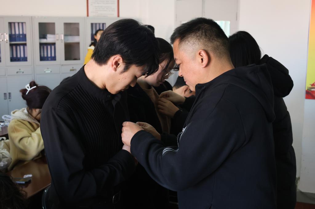 仪式在雄壮的国歌声中拉开序幕,满腔爱国情在嘹亮的歌声中激荡。接着,主持人宣读新团员名单,并由吴磊老师和朱浩楠老师为新团员代表佩戴团徽。在朱浩楠老师的带领下,全体团员面向鲜红的团旗,右手握拳,庄严宣誓,用最洪亮的声音,以崭新饱满的精神面貌,向团组织表明自己的拳拳之心。