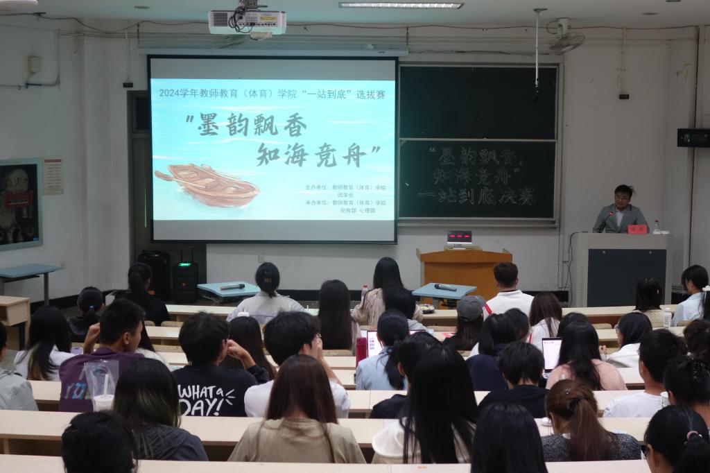 为了提高同学们的综合素养,丰富知识储备,展现蓬勃向上的精神面貌。10月20日晚,教师教育(体育)学院于A5教室举办“墨韵飘香,知海竞舟”一站到底决赛。本次活动由辅导员梁元主持,辅导员朱浩楠、8位参赛选手以及各班观众代表参加本次比赛。