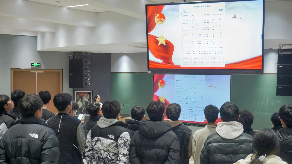 仪式在激昂的国歌声中正式拉开帷幕,歌声嘹亮,饱含着同学们对祖国的热忱与敬意。曲毕,主持人宣读新团员名单。经过严格的考察与选拔,共有91名同学成为了光荣的中国共产主义青年团团员,为团组织注入新鲜血液。朱浩楠老师手执团徽,为新团员代表郑重地佩戴,金色团徽在胸前熠熠生辉,象征着的责任与担当就此传递。新团员们面向团旗,握拳宣誓,誓词铿锵有力,荡气回肠。