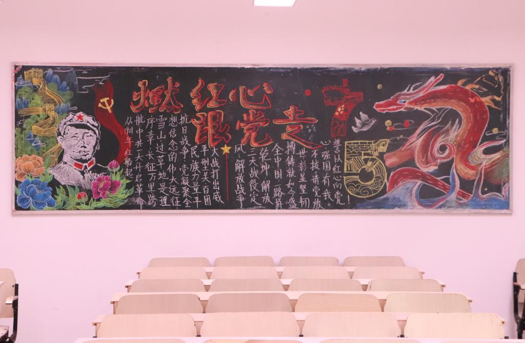 比赛中,各参赛学生小组热情投入,紧扣主题精心创作。有的小组以“金秋既别,雪将临”为主题,黑板上栩栩如生的雪花、憨态可掬的雪人,搭配着充满诗意的文字,仿佛将冬日的美景提前带到了校园。还有小组围绕“红心向党”展开设计,党徽闪耀在黑板中央,长城巍峨,文字激昂,传递出对党的无限忠诚与热爱。