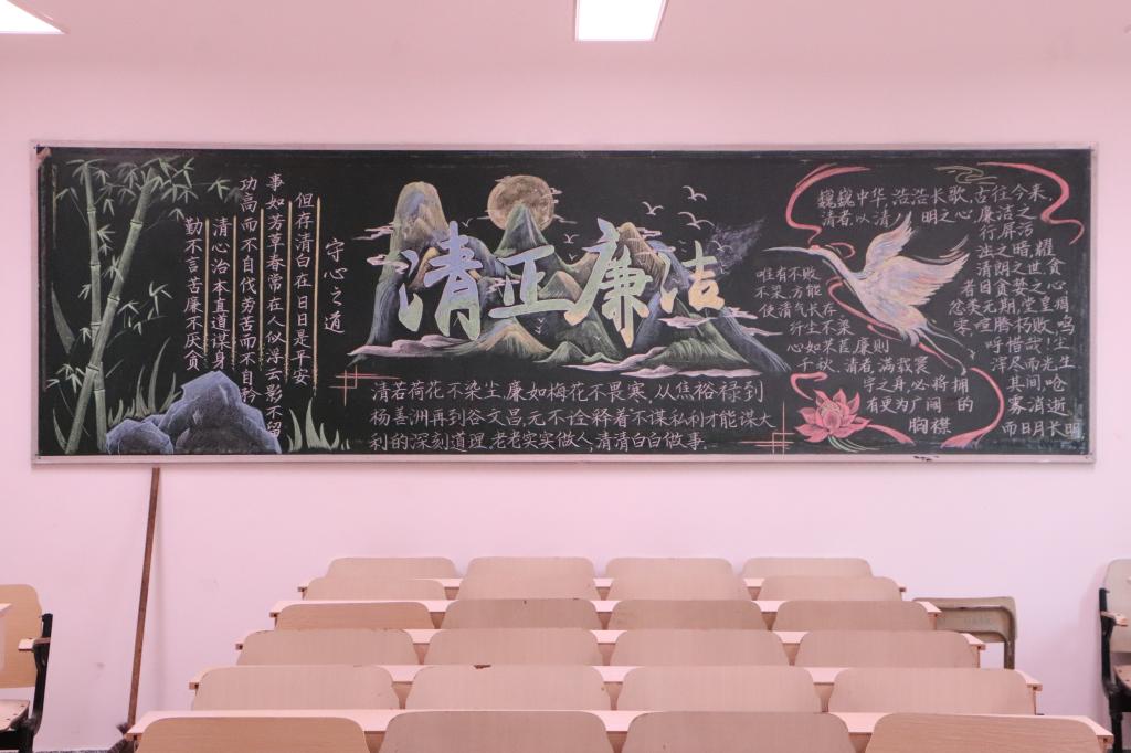 “廉”与“清”主题的黑板报同样令人眼前一亮。“廉”主题的黑板报上,挺拔的翠竹、高洁的莲花与寓意深刻的诗词相得益彰,彰显出廉洁奉公的高尚品德;“清”主题的黑板报则以清新的画面和简洁有力的语句,阐述了清正廉洁的重要意义。无论是粉笔勾勒的线条,还是色彩的巧妙搭配,都展现出同学们的用心与巧思。