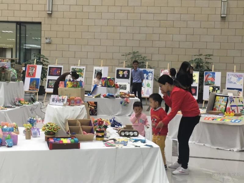 本次展览共设儿童互动式布书,综合材料,玩、教具设计制作和超轻粘土制作4个展台,展厅四周还展出了一些绘画作品和剪纸作品。2 00余件参展作品多为15级、16级小学教育与学前教育专业学生的平时作业,或富有童趣、或新奇大胆、或小巧别致,题材丰富、形式多样、个性鲜明,作品既体现了当前小学与幼儿园各学科、各领域的基础知识,又以儿童们喜闻乐见的绘画、手工、玩具等形式进行呈现,充分体现了小教、学前学生的专业内涵、美术功底和基本技能。
