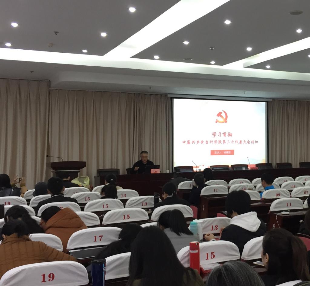3月14日下午,校党委委员、组织部长杨健国在临海校区学术报告厅为教育学院全体教职工宣讲校第三次党代会精神,学院党总支书记赵校民主持宣讲会。