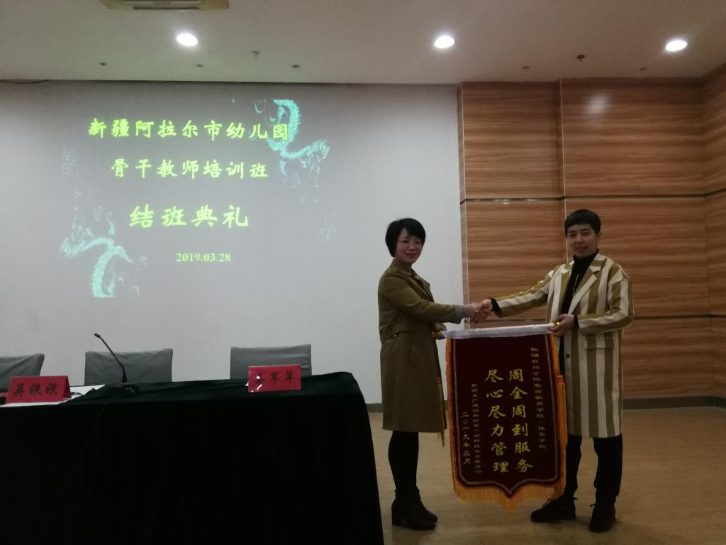 吴银银副院长宣读优秀学员名单,并为她们颁发证书。姜军萍教研员代表阿拉尔市教育局向教育学院赠送“周全周到服务,尽心尽力管理”的锦旗。结业典礼在友好、和谐、欢乐的气氛中落下帷幕。