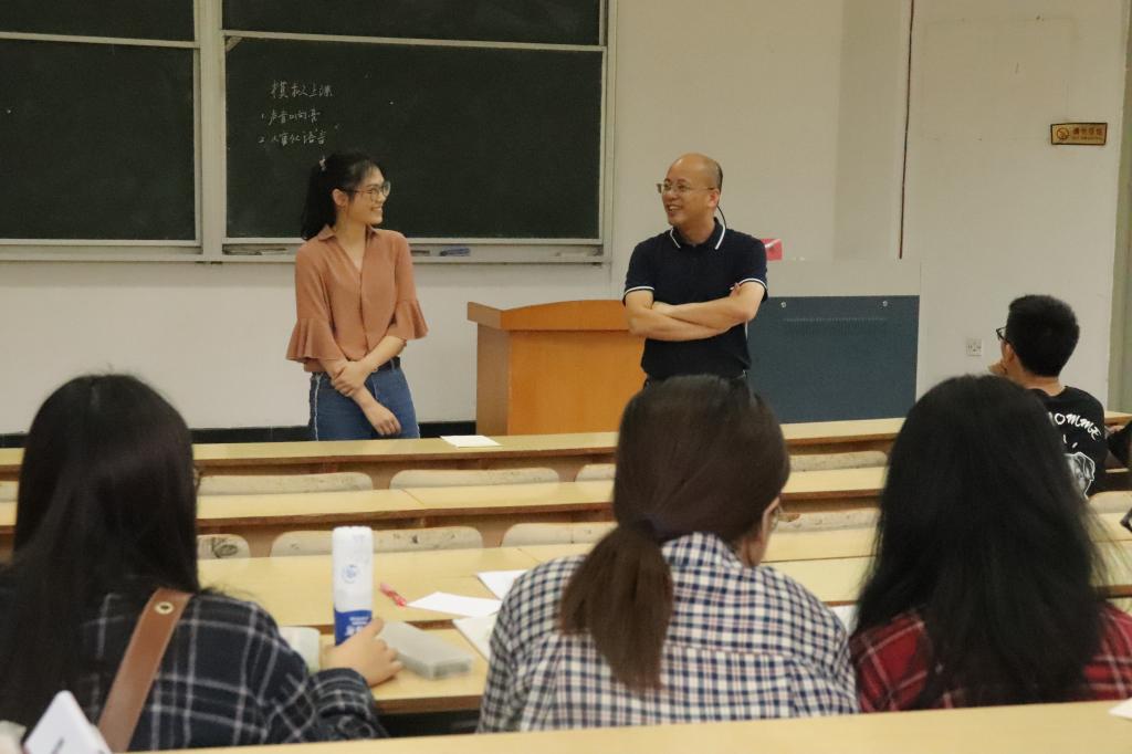 “六个要点”,着重强调“儿童化语言”的重要性。为使在座学生有切身体会,他邀请几位学生现场模拟上课,并进行了一对一指导。颜老师的讲解深入浅出,风趣幽默,现场氛围热烈,在座学生收获颇丰。