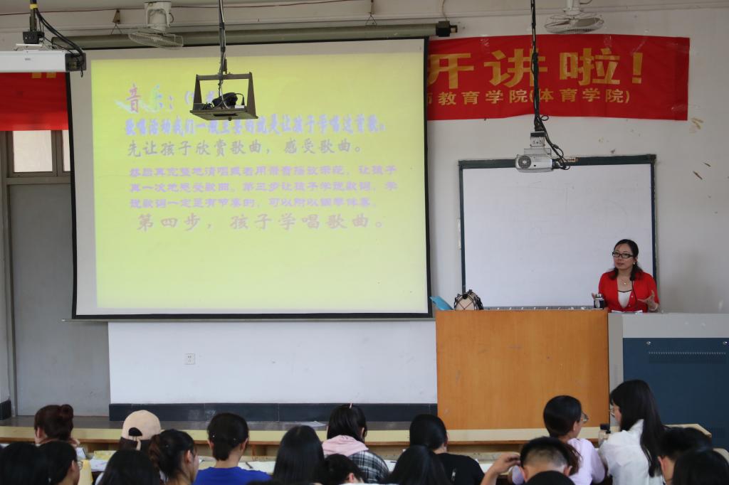 为助力大三学生考编,提升学生面试能力,6月14日,教师教育学院(体育学院)于A4阶梯教室举办了第十期“名师讲堂”讲座,温岭市中心幼儿园园长章佩君应邀担任主讲嘉宾。16级学前专业学生参与本次讲座。