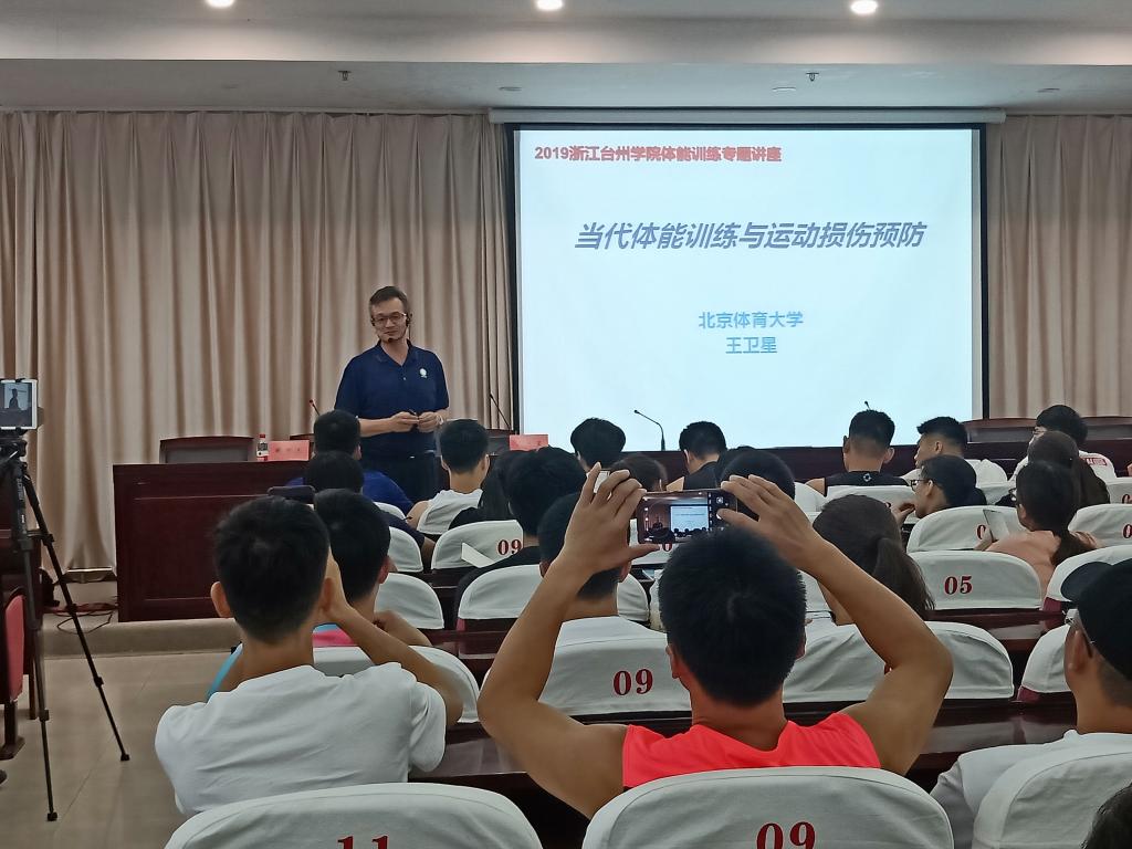 7月1日下午,教师教育学院与临海市教育局体育教研室在临海校区学术报告厅共同举办教学研讨活动,研讨会上邀请北京体育学院教授王卫星作题为《当代体能训练与运动损伤预防》讲座。教师教育学院副院长林辉杰副教授主持本次活动,临海市各主要中小学体育教师、台州学院暑期集训队教练和队员参加。
