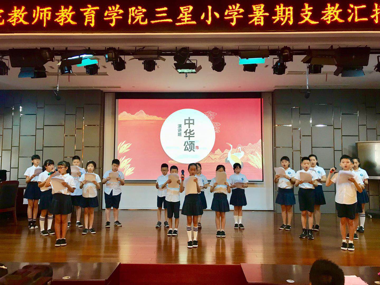 每个班都展示了自己的“拿手好戏”:舞蹈班带来了风格完全不同的舞蹈——优雅动人的芭蕾、活力四射的啦啦操和炫酷夺目的街舞。演讲班的同学首先朗诵了《中华颂》,铿锵有力的声音激起了观众们的爱国情怀;紧接着一首古筝曲《一曲相思》,琴声余音绕梁,更是让人拍手叫好。书法班展现给我们的是书法作品走秀和现场书法创作——《三星小学的秘密》,所写的作品笔画流畅、横平竖直。音乐班呈现了有趣的音乐剧《音乐之声》,流利的英语再加孩子们清脆的歌声,使观众久久沉醉其中。