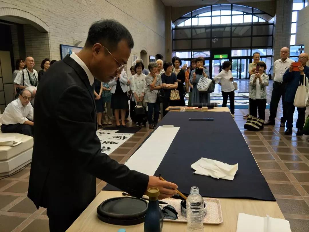 受台州市政府委托,教育学院王波老师、刘波亮老师带领台州市书法家协会一行6人赴日本敦贺参加“敦贺节”及举办书法、摄影交流系列活动。9月3日上午,敦贺市政府为代表团举行了隆重的欢迎仪式,敦贺市市长渕上隆信先生、敦贺市观光部长松叶启明先生、敦贺市观光交流科长增田一条先生等出席欢迎仪式。
