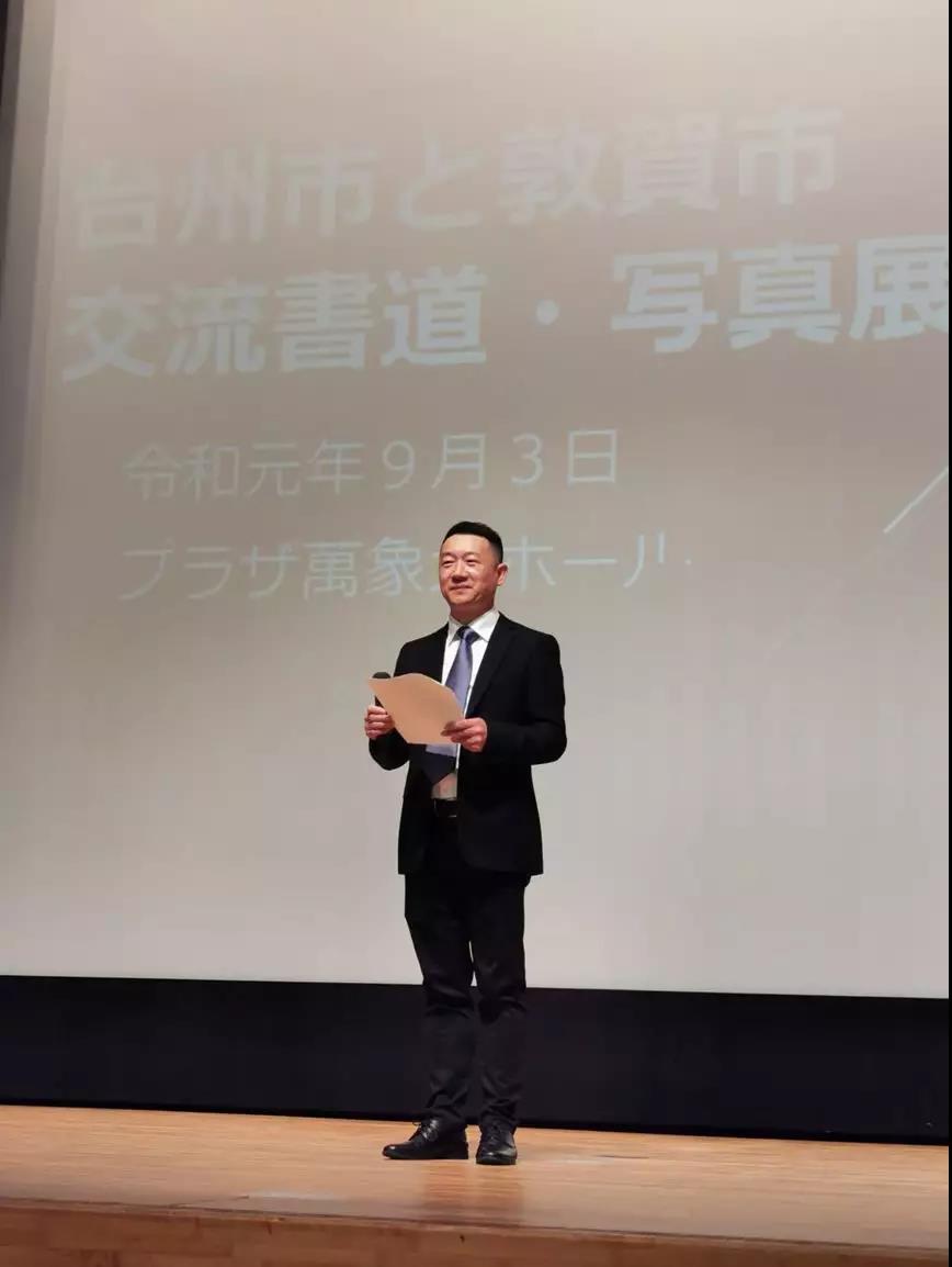 王波老师在致辞中表示,非常高兴作为台州市政府委派的民间文化友好交流团,来到美丽的敦贺市进行访问,感谢渕上隆信市长以及在座各位朋友的热情邀请和盛情款待!王老师详细回顾了台州、敦贺两座城市的历史渊源和缔结友好城市以来的交流历史,表达了台州市长张晓强对此次“敦贺节”活动的良好祝愿和邀请隆信市长回访的意愿,简要介绍了台州市书法家协会的基本情况,表示此次的文化交流活动可以成为双方交流进一步密切、合作进一步深化、友谊进一步加深的新起点,两市的友好关系会因为越来越频繁的“文化碰撞”更上一层楼!