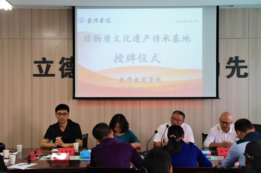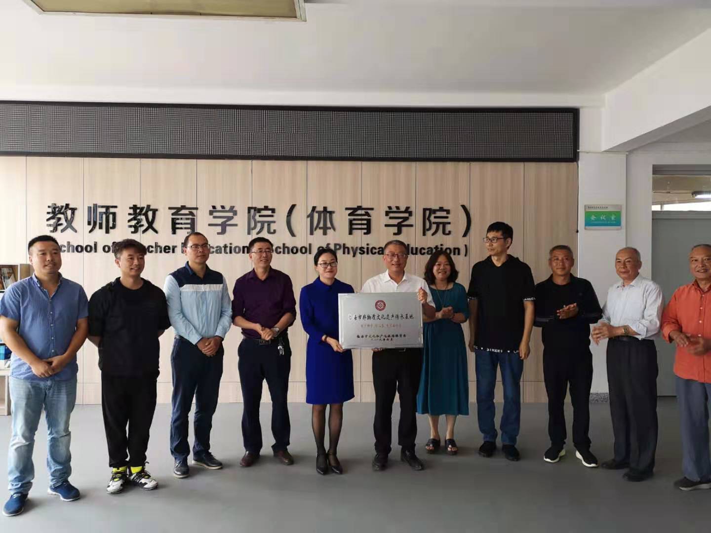 10月14日上午,临海市国家级非遗项目黄沙狮子、浙江省级非遗项目大石车灯戏、缩山拳传承基地授牌仪式在教师教育学院(体育学院)举行。临海市文广旅体局局长王荣杰,临海市文广旅体局副局长冯海燕,非遗中心主任张志军,非遗协会秘书长沈建中,黄沙狮子传习所主任、传承人王建,缩山拳传承人马曙明,大石车灯戏传承人金学文、金仁罡,教师教育学院院长周瑶,党总支书记赵校民,副院长林辉杰,覃宇德博士,樊坤老师参加了授牌仪式。