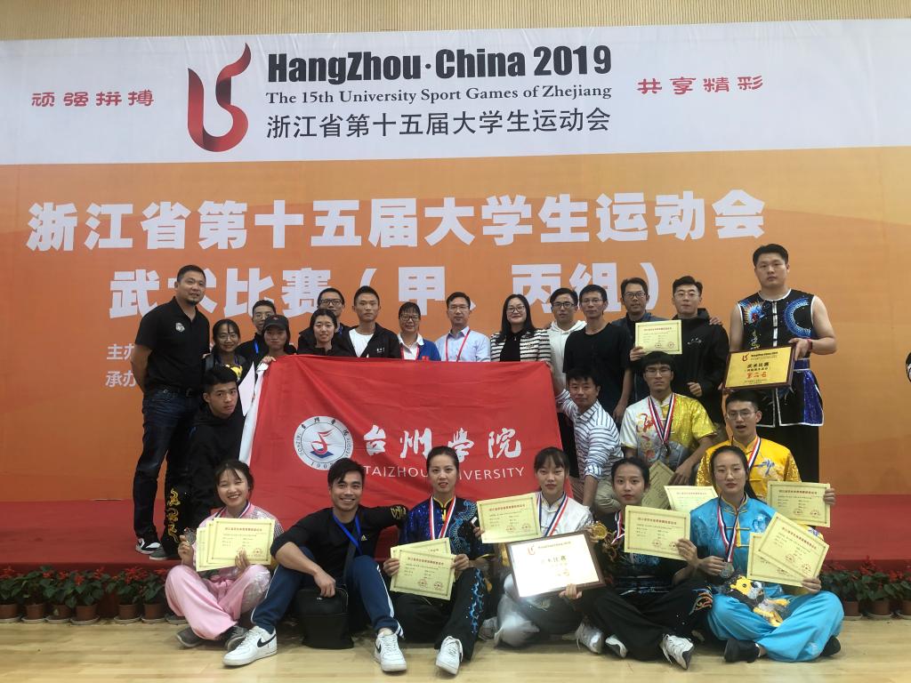10月18日至20日,浙江省大学生第十五届运动会甲、丙组武术比赛在杭师大仓前校区举行,来自全省各地的41所高校参加了本次比赛的角逐。我校武术队由教师教育学院党总支委员鲁建波老师带领,樊坤、陈嵚、覃宇德、朱欣、章波任武术指导老师;教师教育学院院长、校体委副主任周瑶教授与校体委秘书长戴晓捷老师赴现场观赛看望参赛师生,并参加颁奖仪式。