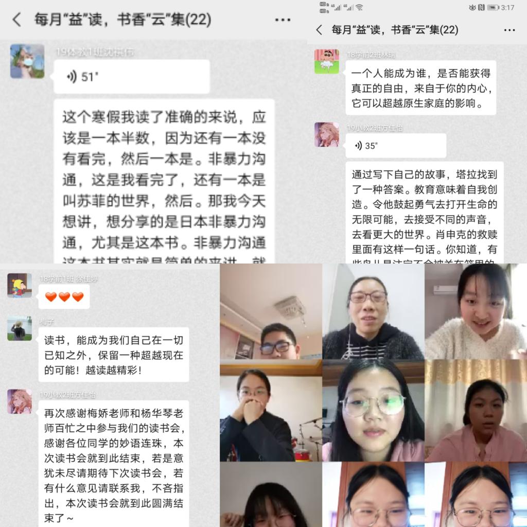 紧接着,杨华琴老师点评了同学们的阅读感想,提倡大家爱上阅读,在阅读中快乐,在快乐中成长。最后,梅娇老师指出每一位同学都能成为一个阅读的种子,希望阅读能成为生活中的一个习惯,呼应了本次线上行知读书会的主题。