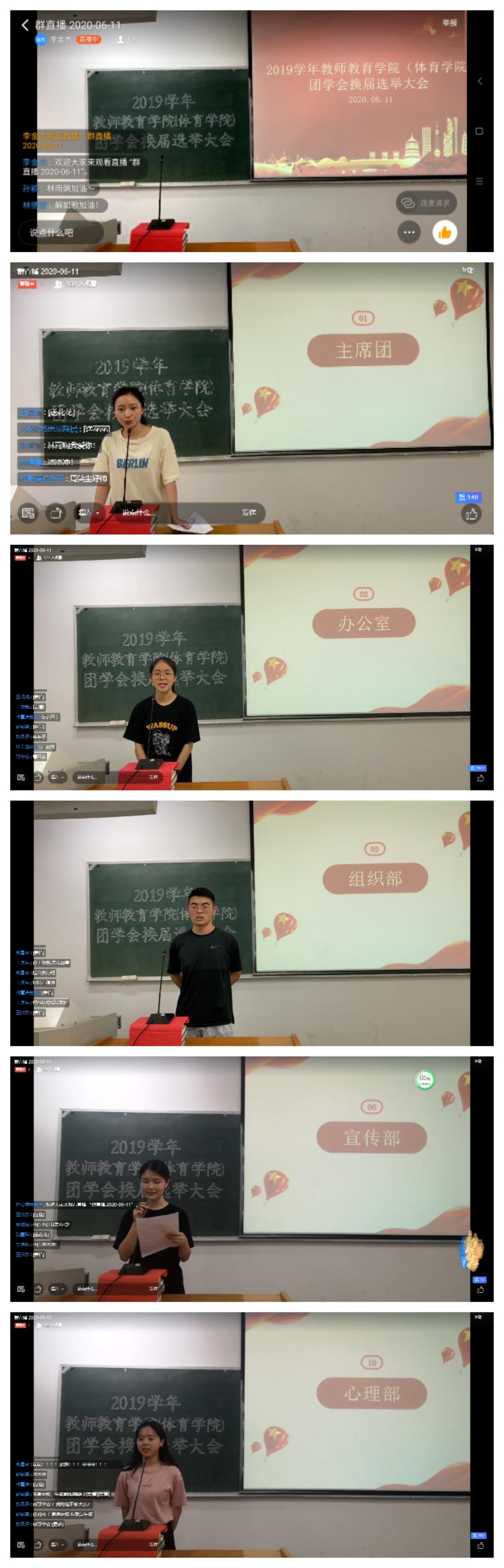 为选拔优秀的团学干部,推动学院学生工作蓬勃开展,6月11日晚,教师教育学院(体育学院)于3306教室举办团学会换届选举大会。本次选举大会通过网络直播的方式进行,学院党总支副书记梅娇、党总支委员鲁建波、全体辅导员及大众评审通过网络参加会议。