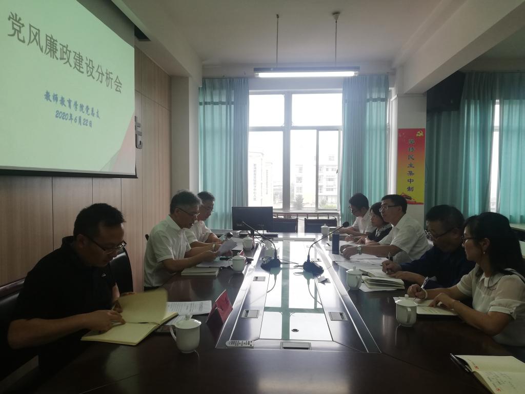 6月22日,教师教育学院召开2020年上半年党风廉政建设分析会,就学院党风廉政建设落实情况进行分析汇报。校党委委员、组织部长杨健国,校工会专职副主席江岳军、校办王华同志到会指导,学院党政班子成员参加了分析会。
