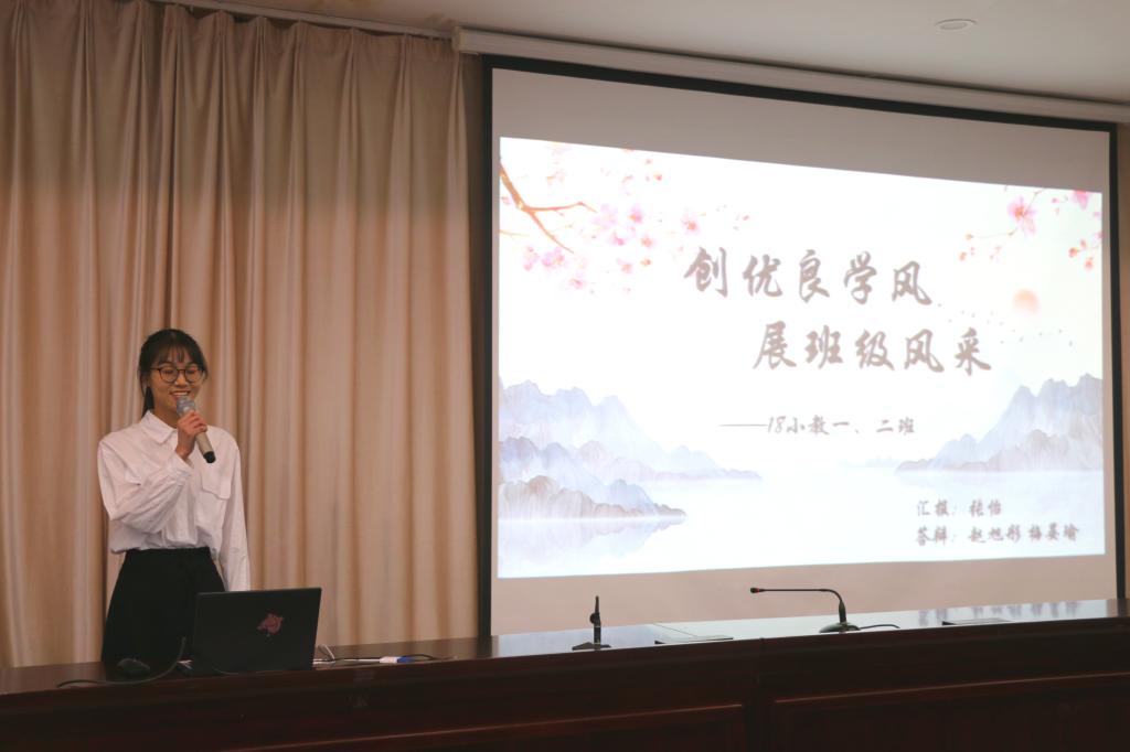 活动伊始,主持人林姝琦简要介绍了活动的流程及参与的班级。在主讲环节中,每个班级的主讲人详细阐述了本班班风建设与对未来的展望,通过ppt展示班级风貌及集体所获各项荣誉。针对每班不同的学风与班级氛围,评委老师提出相应问题,答辩学生认真思考流利作答,并仔细听取老师的建议。