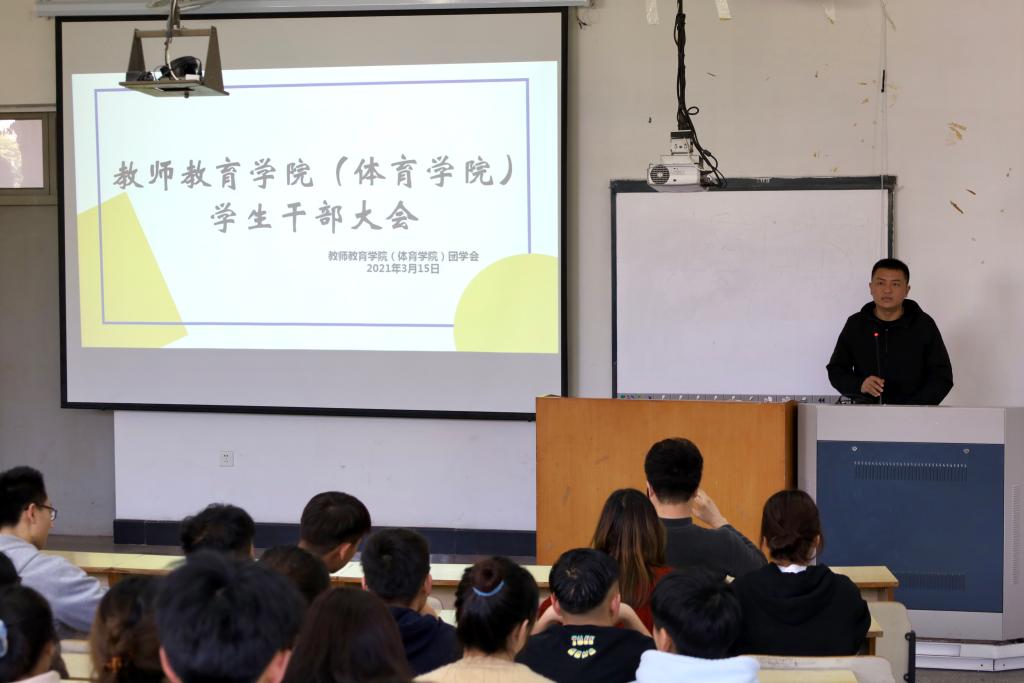 为安排新学期相关事宜,加强学生干部队伍建设,3月15日中午,教师教育学院(体育学院)于A4教室召开学生干部大会。学院党总支副书记吴磊出席会议,辅导员阮溶明、朱萌,学院班干部代表、团学干部代表参加。