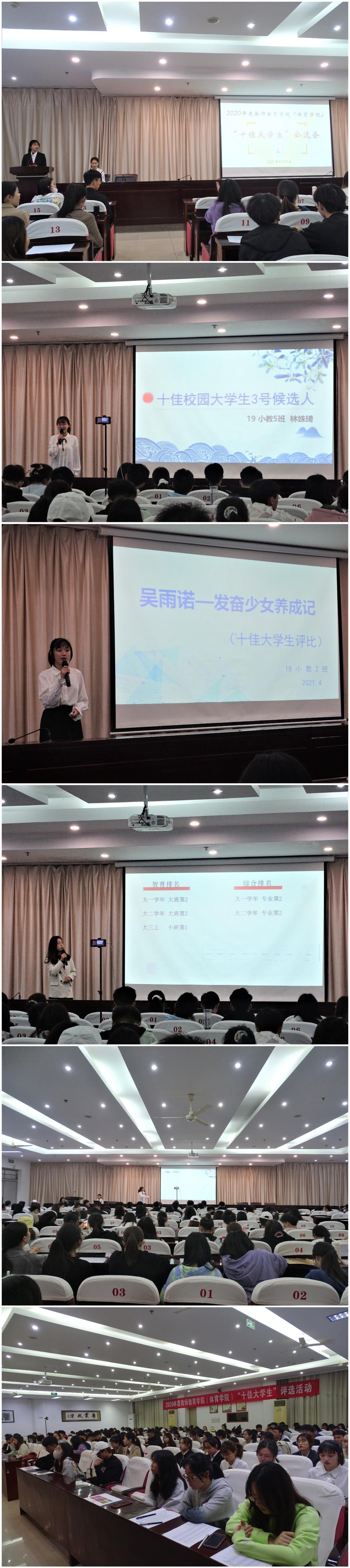 为展示我院优秀学子风采,4月10日晚,教师教育学院(体育学院)于临海校区图书馆六楼学术报告厅举行2020年度“十佳大学生“公选会。学院党总支副书记吴磊,全体辅导员线上出席,各班大众评委参加现场活动,共24位候选人角逐本年度“十佳大学生”。