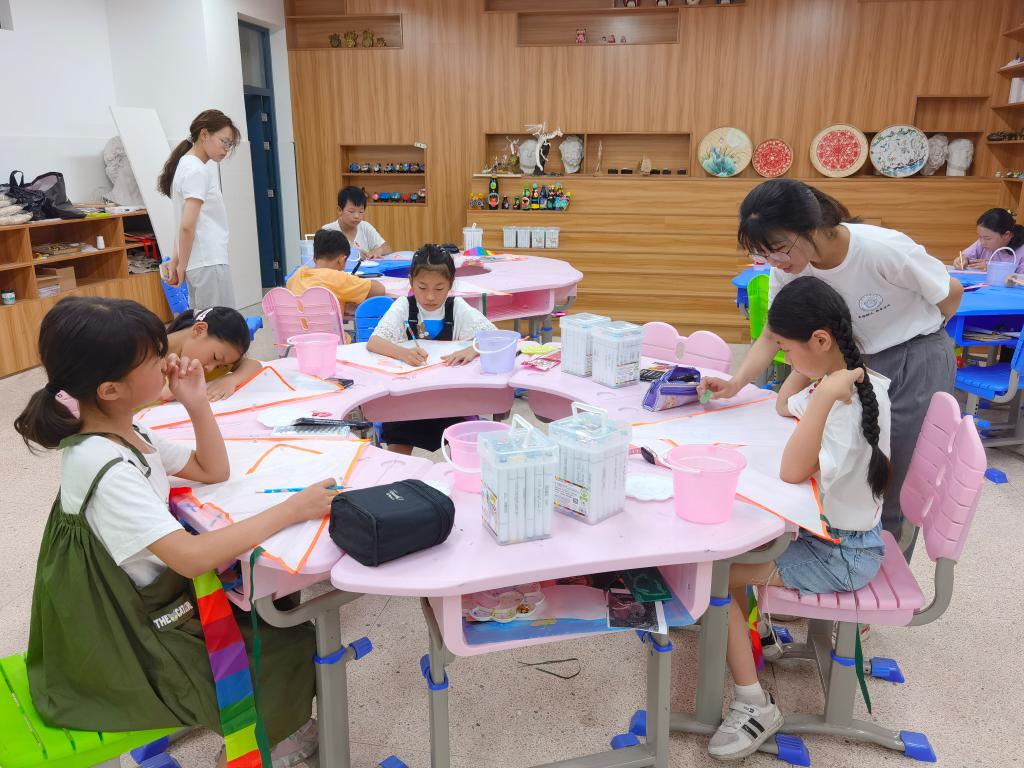 武术班级在操场上进行练习,同学们精神十足,斗志高昂,练起套路来不喊苦不喊累。美术课形式多样,扎染、超轻黏土、手绘风筝等美术活动提高了同学们的热情。朗诵班的老师强调从重音、情感两个方面理解课文,对学生耐心讲解,悉心辅导。特色班依托建党百年背景安排红色知识竞答,红色印记绘画等有意义的活动,增强学生的爱国情与爱党心。音乐舞蹈班的老师根据每个同学的基础进行适当的节奏以及动作练习,随着课程的进展不断加大难度。书法班的同老师教授基本笔画和汉字,使学生能在融会贯通中进步。