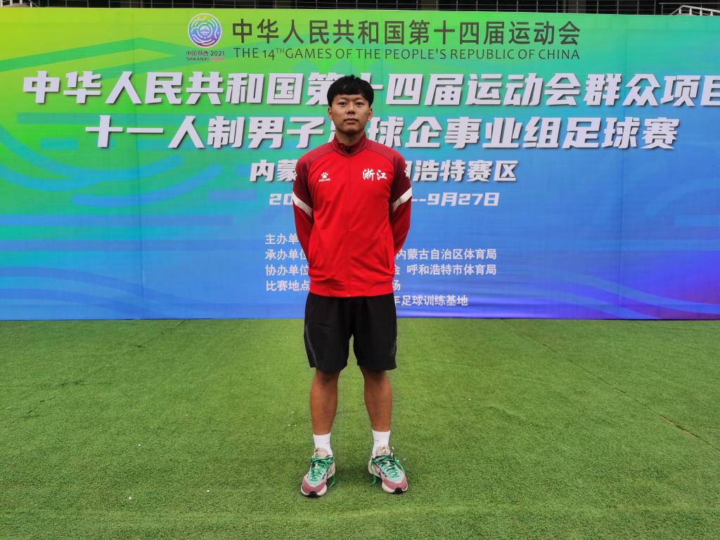 在前不久落幕的全运会中,浙江代表队斩获群众项目十一人制男子足球企事业组比赛冠军,这支冠军队伍中活跃着台州学院校友胡仪斌的身影。