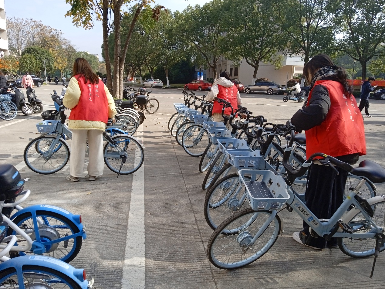 活动中,党员和志愿者们开始对共享单车进行梳理,并把食堂边随意停放、倒放的单车主动扶起并有序摆放整齐,将占道、乱停乱放的共享单车推到指定停放点,同时学生党员和志愿者们还主动清理地面垃圾。为了提升同学们文明用车的意识,党员和志愿者们还向过往同学宣传文明骑行、有序停放的做法,引导骑行者将共享单车停放在相应的区域。
