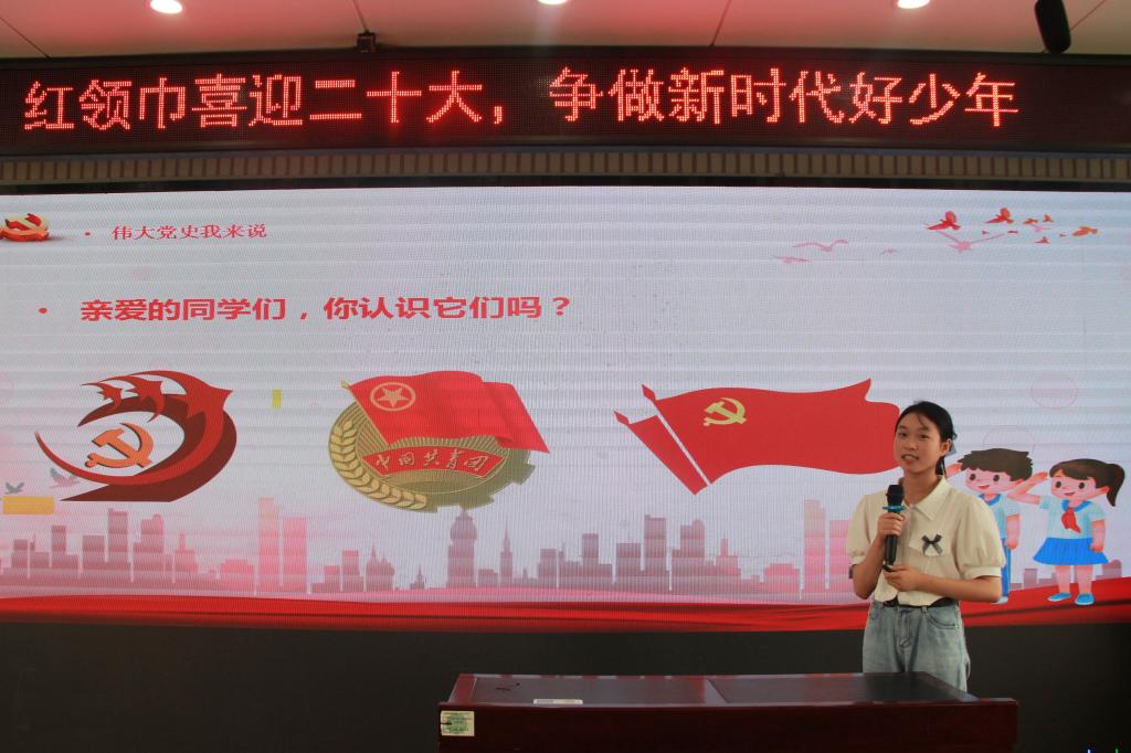 山东大学“后浪”青春宣讲团代表曹若萱从“喜迎二十大,一起向未来”“伟大党史我来说”“争做新时代好队员”三个模块出发,用通俗易懂的语言为孩子们讲解了二十大相关时政知识、中国共产党的诞生与发展以及争做新时代好队员应当具备的品质。