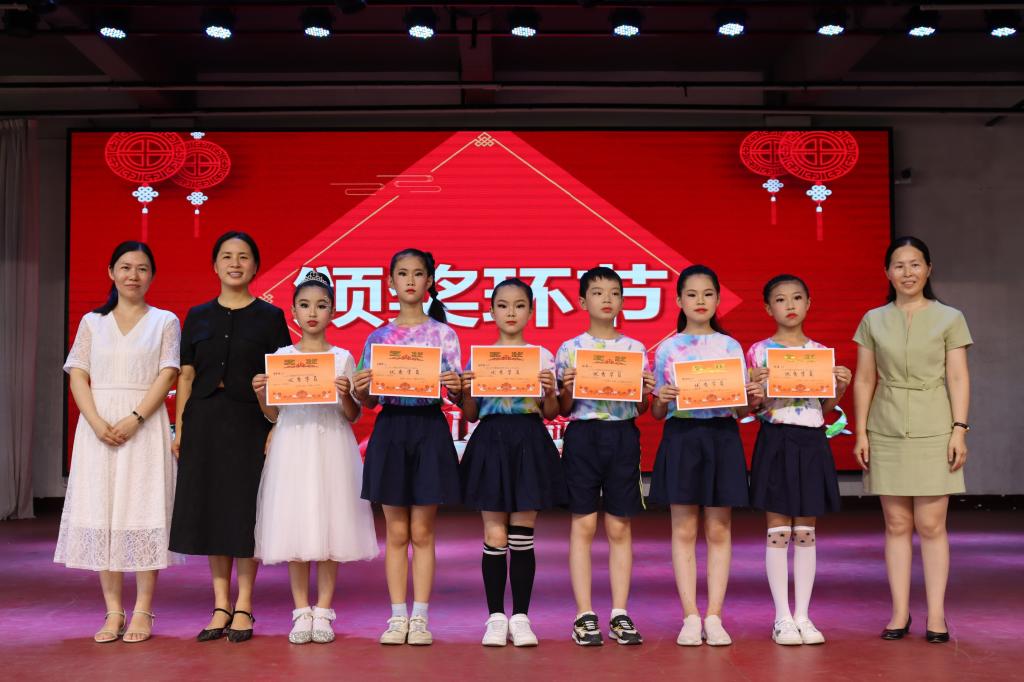 此次文艺汇演活动是暑期兴趣班孩子们在校十五天的学习成果展示,通过合唱、舞蹈、走秀、集体朗诵等孩子们喜闻乐见的方式,传承浙里红色基因,汲取时代奋进伟力。舞台上的孩子们个个精神饱满,自信满满,通过舞蹈、唱歌、朗诵等形式热情讴歌党的光辉历程和丰功伟绩,深情表达对党和国家的无限热爱和美好祝福,以实际行动迎接党的二十大胜利召开。“听说美术班孩子们的衣服都是自己扎染的,准备的花束也是孩子们自己手工制作的。”坐在前排的天台县妇联副主席王嫱薇对老师和孩子们的精心准备赞不绝口。活动现场,与会领导为暑期兴趣班优秀学员颁发奖状并合影留念。