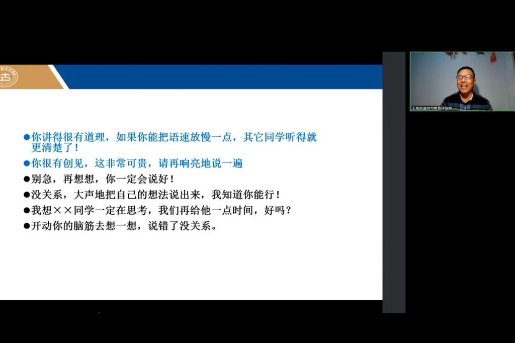 本次线上会议的成功举行,使同学们不仅从理论上深刻认识到课堂评价语重要性,也学习了实用、多样化的课堂评价语,为其课堂评价水平的提高起到了积极作用。