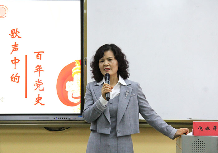 倪淑萍教授阐述了自己开展“歌声串党史”课程的思想历程,希望同学们通过聆听建党以来不同历史时期的歌曲重温奋斗史、憧憬新征程。倪淑萍教授将课程分为序曲与四个乐章。在序曲中,倪教授介绍了《国际歌》的创作与发展历程。在第一乐章“开天辟地”中,倪教授按时间顺序对《“八一”起义歌》《三大纪律八项注意》等歌曲的作者、创作背景和含义进行说明,并与同学们一同观看相应的演唱视频。在第二乐章“革命建设”和第三乐章“改革开放”中,倪教授对《我的祖国》《唱支山歌给党听》等歌曲进行深刻解读,分享了自己独特的体会,并在观看视频时引导同学们感受合唱的不同形式。在第四乐章“不忘初心”中,倪教授通过分享《小康之路》《引航》等歌曲,呼吁同学们记录中国共产党风雨兼程、奋斗不止的光辉历程,在歌声中铭记历史,共同唱响美好明天。