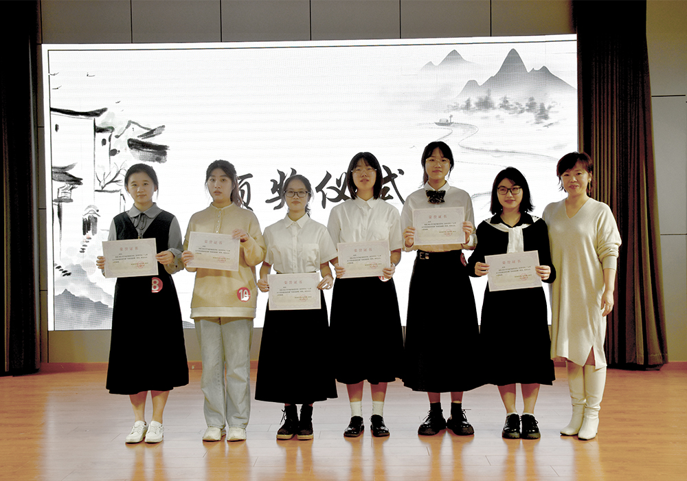 比赛接近尾声,主持人依次宣读了获奖选手的名单,并由评委老师为各位获奖选手颁奖。郑碧瑶同学以她精彩的朗诵和演讲荣获本次大赛的一等奖,王彦人、陈佳洁同学获得了二等奖,另外九名参赛选手分别获得了三等奖和优胜奖。
