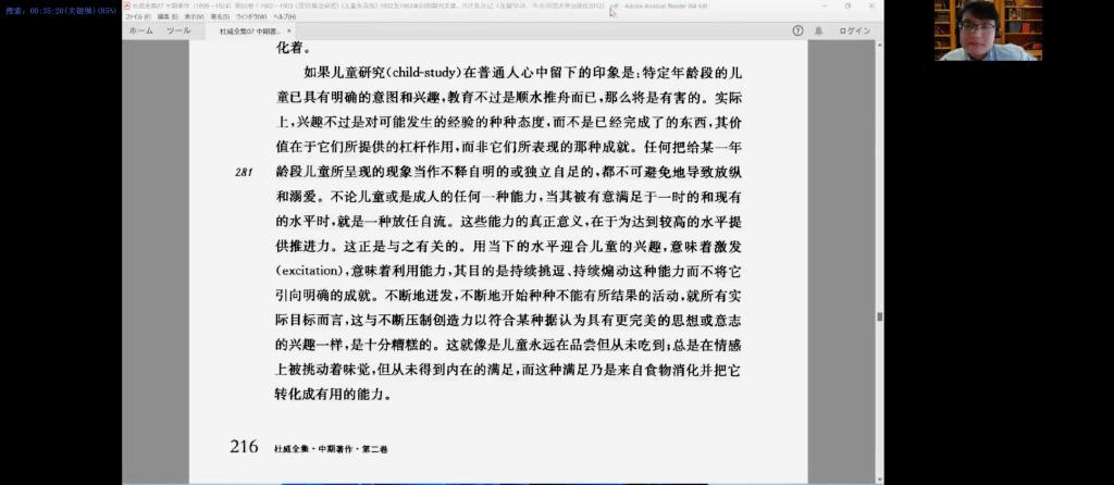 本次讲座选择了杜威《儿童与课程》这一篇经典教育学论文作为导读材料,事先分享给学生练习阅读,并由刘幸现场带领学生条分缕析地拆解杜威的学术思想和写作方式,最后结合学生自身阅读时遇到的困惑和困难进行答疑。