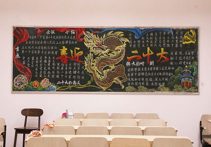 工作人员提前为选手准备好了粉笔、板擦、尺子、椅子等工具,选手自行安排时间到分配好的教室进行黑板报创作,每位选手都准备了丰富的绘画素材以及文字内容。在创作的过程中,每位选手都以饱满的热情以及认真的态度投入到了自己的作品创作中。选手们用时间和努力装点了一间间教室后面的一块块黑板,展现出了自己精湛的绘画功底以及行云流水的黑板字书写能力。