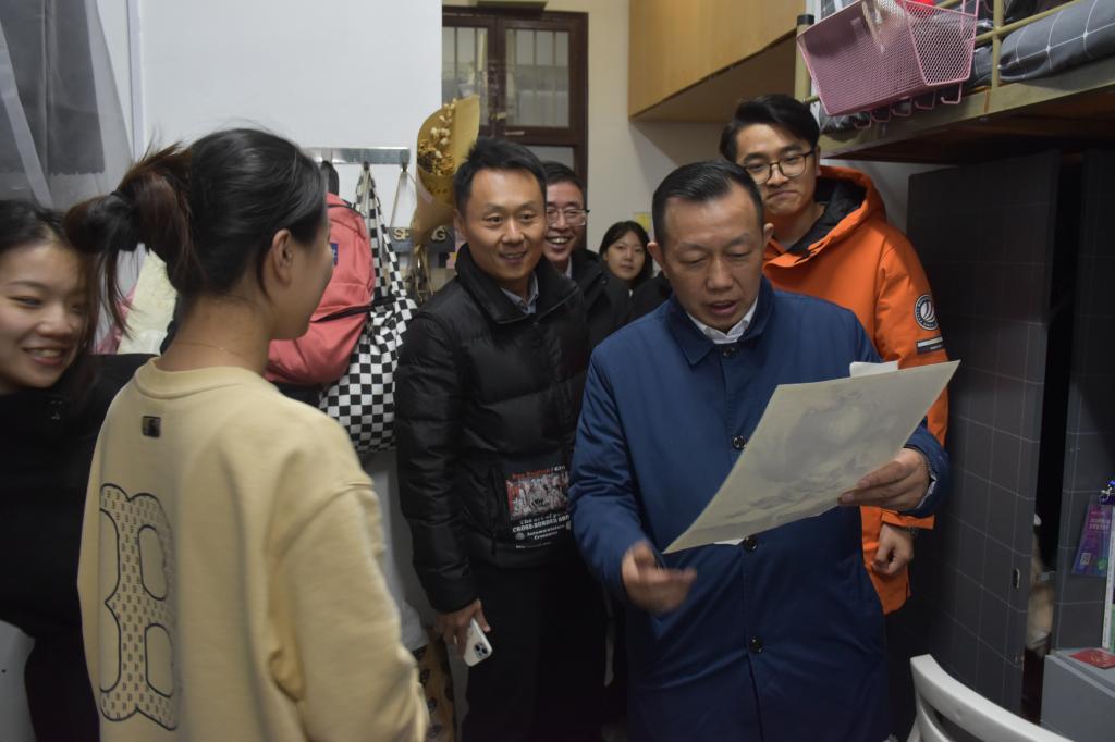 12月1日下午,校党委副书记、校长乐传永走进教师教育学院(体育学院)学生寝室,为联系寝室学生答疑解惑、共话成长,院党委书记赵校民陪同走访。